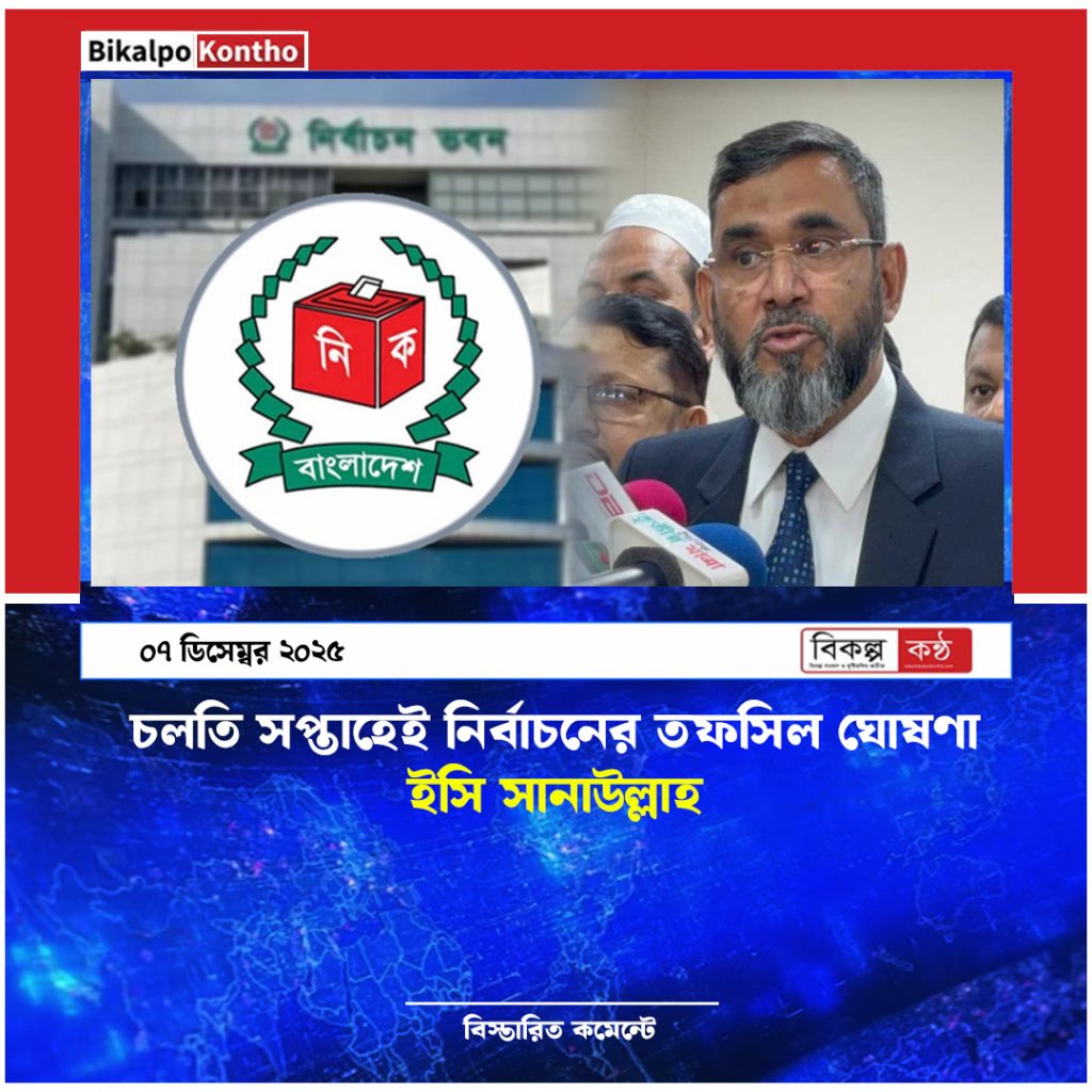 রাজধানীর আগারগাঁওয়ে নির্বাচন ভবনে রোববার (৭ ডিসেম্বর) অনুষ্ঠিত কমিশন সভা শেষে নির্বাচন কমিশনার ব্রিগেডিয়ার জেনারেল (অব.) আবুল ফজল মো. সানাউল্লাহ জানান, চলতি সপ্তাহের মধ্যেই ত্রয়োদশ জাতীয় সংসদ নির্বাচন এবং গণভোটের জন্য তফসিল ঘোষণা করা হবে।