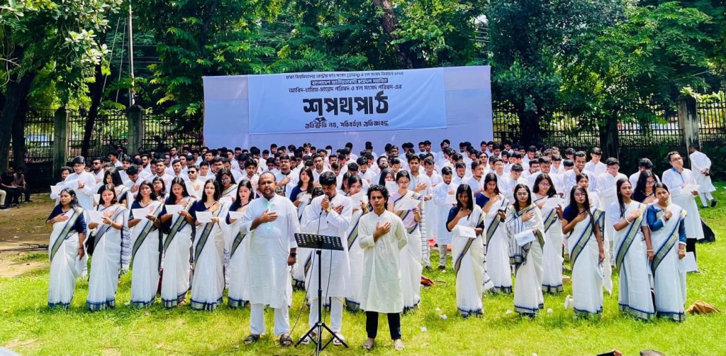আজ আমরা শত বছরের ঐতিহ্যবাহী, দেশের শ্রেষ্ঠ বিদ্যাপীঠ, বাংলাদেশের স্বাধীনতা, গণতন্ত্র এবং গণমানুষের মুক্তির আকাঙ্ক্ষার ধারক ও বাহক ঢাকা বিশ্ববিদ্যালয়ের এই পবিত্র মাটি, ঐতিহাসিক বটতলায়, আপনাদের সকলের সামনে দাঁড়িয়ে, ঢাকা বিশ্ববিদ্যালয় কেন্দ্রীয় ছাত্র সংসদ নির্বাচন ও হল সংসদ নির্বাচন ২০২৫-এ বাংলাদেশ জাতীয়তাবাদী ছাত্রদল সমর্থিত প্যানেলের প্রার্থী হিসেবে-(১) আমরা শপথ করছি যে, প্রতিটি শিক্ষার্থীর জন্য একটি আনন্দময়, বসবাসযোগ্য এবং নিরাপদ ঢাকা বিশ্ববিদ্যালয় ক্যাম্পাস গড়ে তোলার লক্ষ্যে বিগত ফ্যাসিবাদী শাসনামলের ঘৃণিত গণরুম প্রথা, গেস্টরুম নির্যাতন, জোরপূর্বক রাজনৈতিক কর্মসূচিতে যোগদানের জন্য বাধ্য করানো এবং ভিন্নমতের জন্য অত্যাচার ও নিপীড়ন চালানোর যে রাজনৈতিক অপসংস্কৃতি গড়ে উঠেছিল, যেকোন মূল্যে আমাদের ক্যাম্পাসে তা আর কখনো ফিরে আসতে দিবো না।