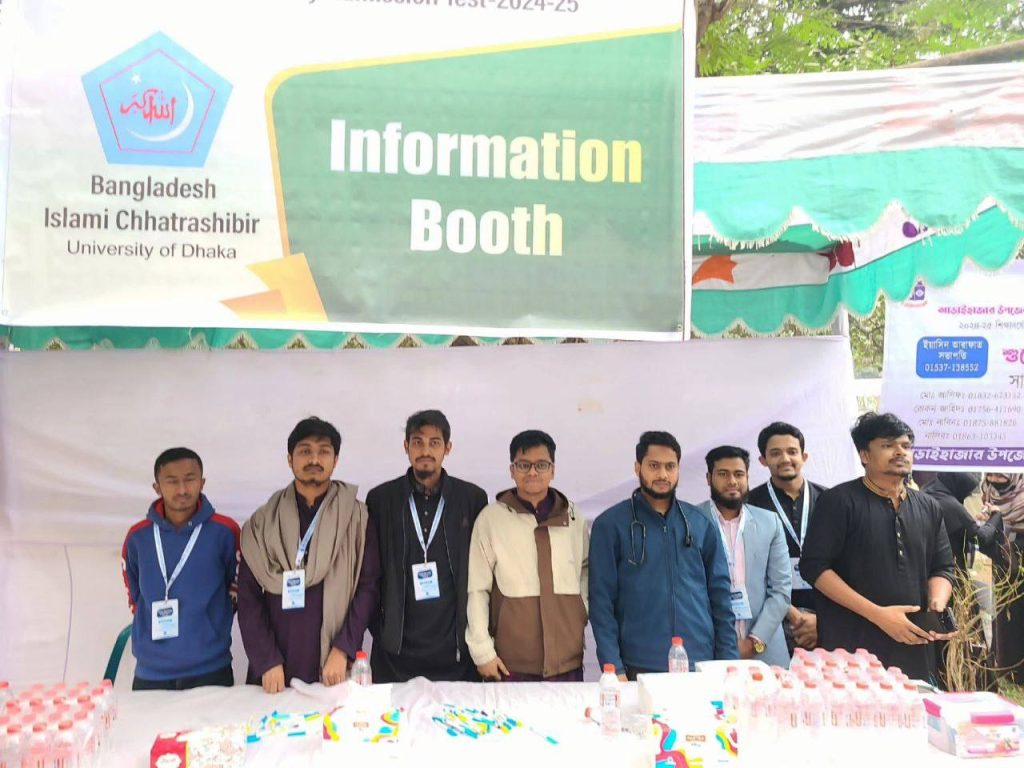 বিজ্ঞপ্তিতে আরও বলা হয়েছে, ইনফরমেশন বুথগুলোতে ছাত্রশিবিরের নির্ধারিত ভলান্টিয়াররা ভর্তি পরীক্ষার্থীদেরকে নির্দেশনা দিয়ে সহায়তা করছেন। প্রতিটি বুথে একটি মেডিকেল টিম ও প্রাথমিক চিকিৎসার জন্য প্রয়োজনীয় ওষুধের ব্যবস্থা রয়েছে। কোনো পরীক্ষার্থী যদি হঠাৎ অসুস্থ হয়ে পড়েন তাহলে সেখান থেকে প্রাথমিক চিকিৎসা গ্রহণ করতে পারবেন। এছাড়াও ইনফরমেশন বুথে পরীক্ষার্থীদের জন্য পর্যাপ্ত পানি ও কলমের ব্যবস্থাও রাখা হয়েছে।