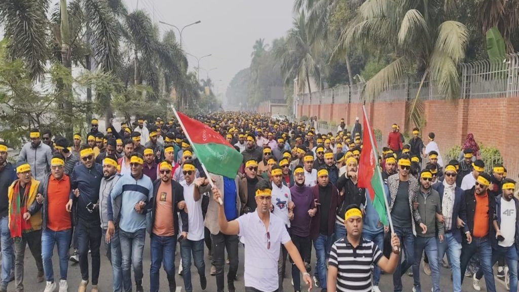 নেতাকর্মীরা ‘এই মুহূর্তে দরকার, নির্বাচিত সরকার’, “দিল্লি না ঢাকা, ঢাকা ঢাকা’সহ বিভিন্ন স্লোগান দেয়।