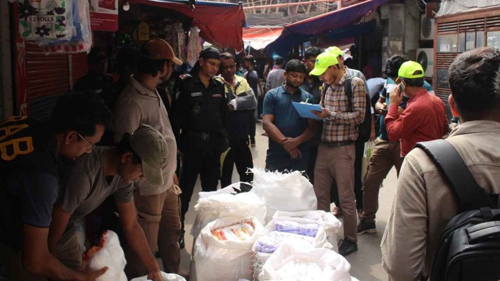 র‍্যাবের অভিযান রাজধানীতে ১৫৫৫ কেজি নিষিদ্ধ পলিথিন জব্দ, ৬ প্রতিষ্ঠানকে জরিমানা