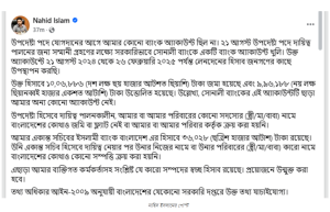 নাহিদ ইসলামের ফেসবুক পোস্টটি হুবহু নিচে তুলে দেওয়া হলো—