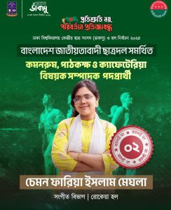 কমনরুম, রিডিংরুম ও ক্যাফেটেরিয়া বিষয়ক সম্পাদক পদে ছাত্রদল মনোনীত প্রার্থী চেমন ফারিয়া ইসলাম মেঘলা মনে করেন, ঢাকা বিশ্ববিদ্যালয়ের প্রত্যেকে মেয়েই জানে বট আইডি মানেই শিবিরের আইডি।